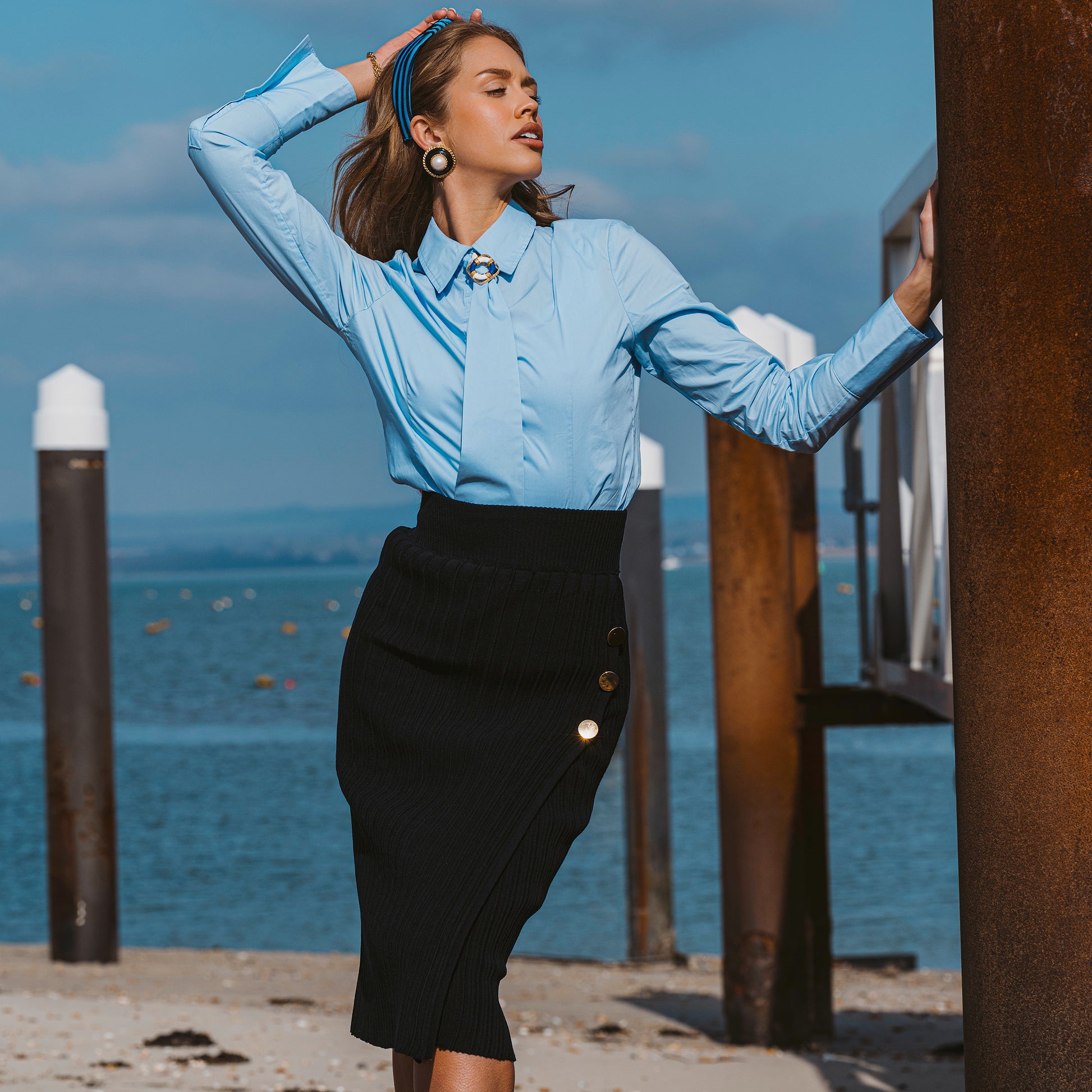 Designed to flatter your silhouette, the Sailor Longline Pencil Skirt features a sleek, elongated shape that accentuates your curves in all the right places. Whether you're strolling along the boardwalk or enjoying a sunset dinner by the sea, this skirt will keep you looking polished and put-together throughout your travels.