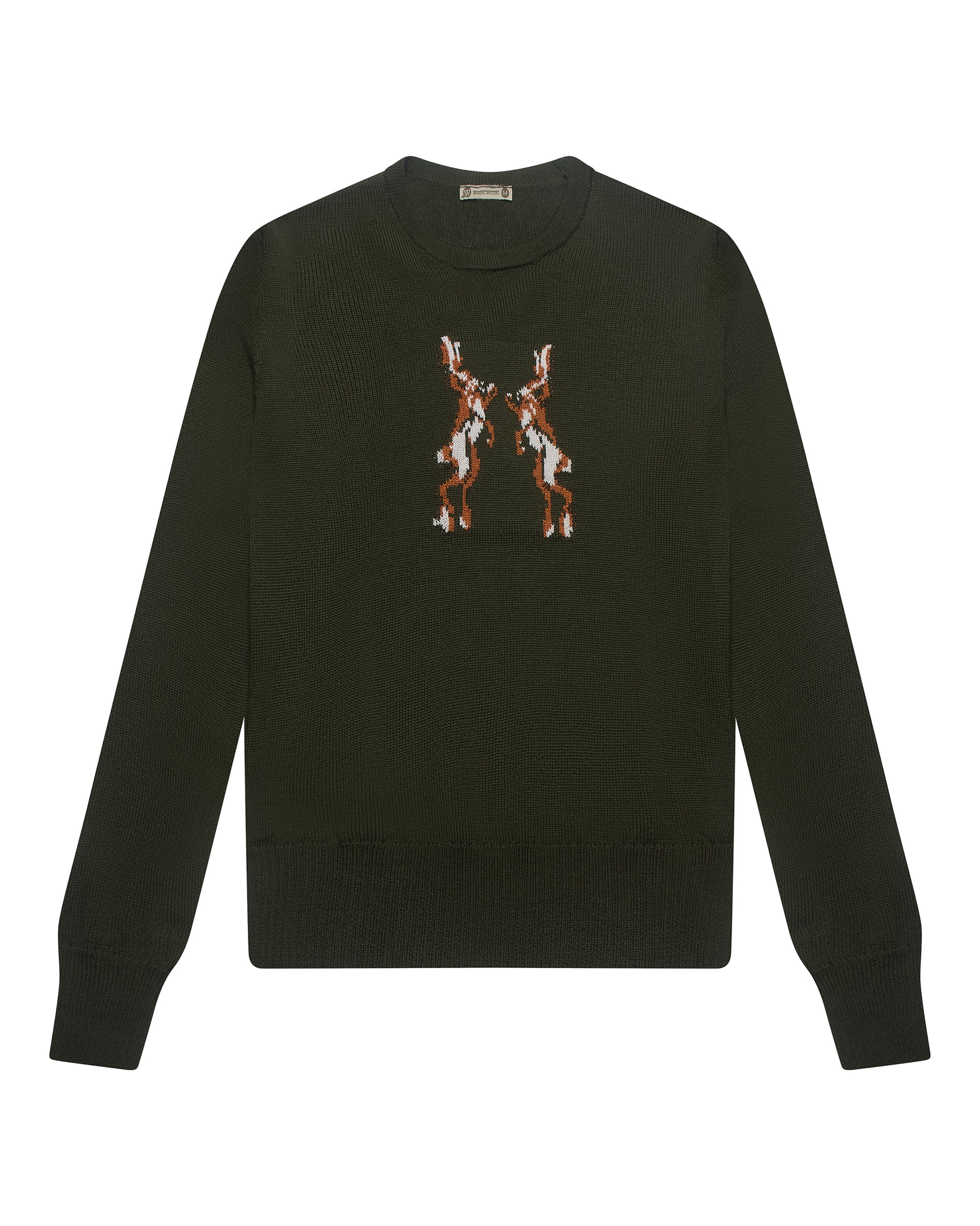 Inspired by the untamed energy of British wildlife, the Boxing Hare Jumper is a celebration of countryside character and tradition. Knitted in Nottingham from 100% merino wool, this jumper features two hares mid-battle – a classic springtime sight captured in stitch.