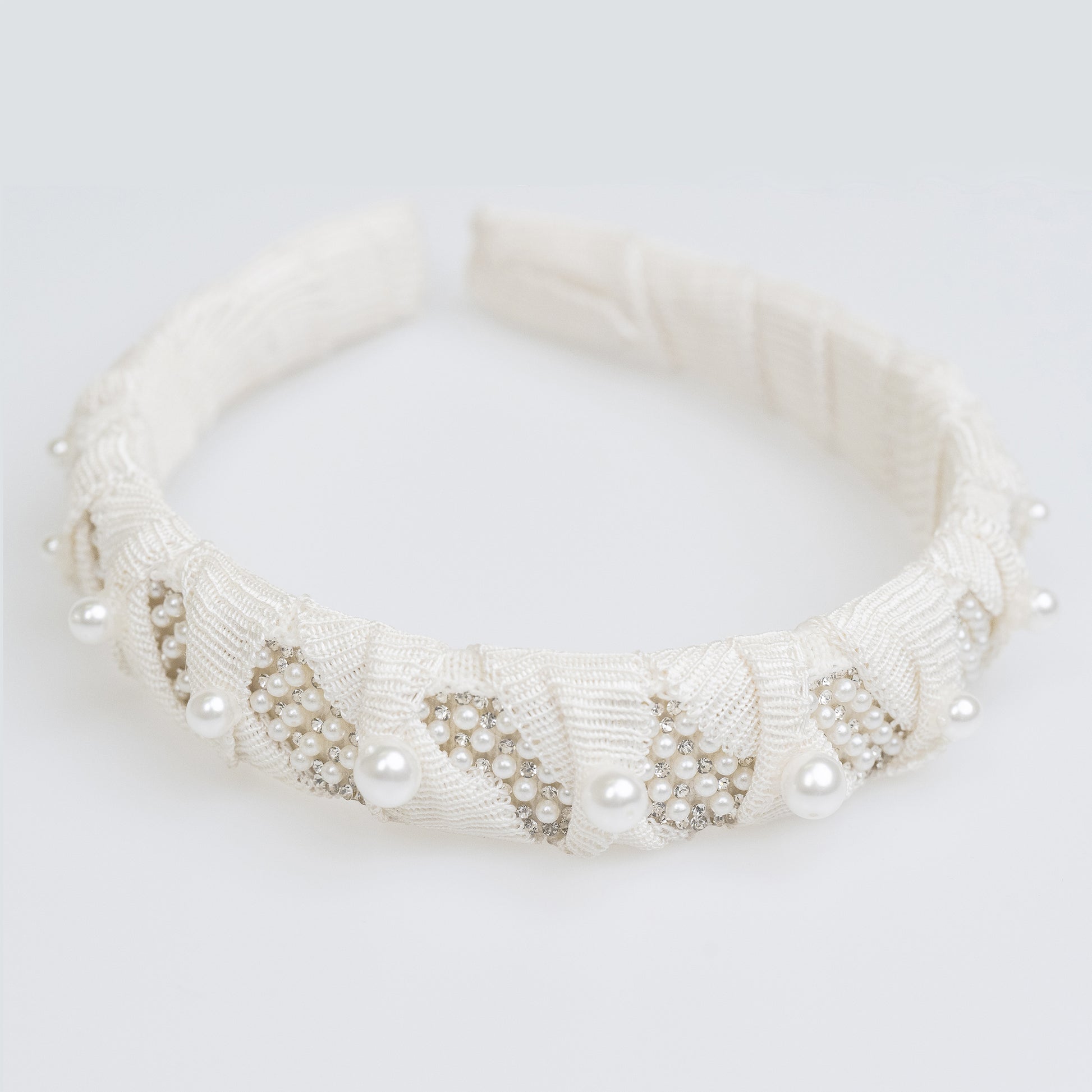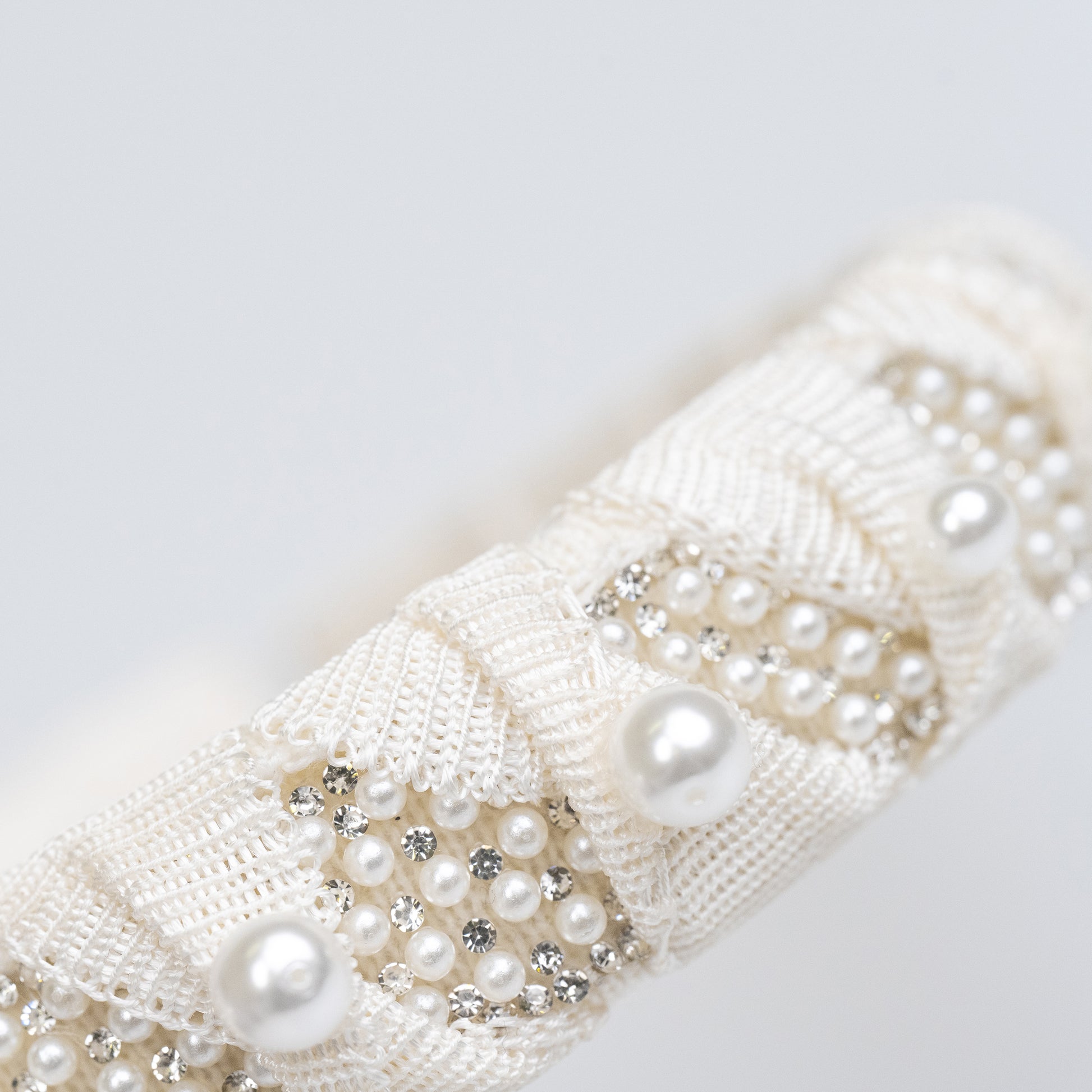 A vision of timeless elegance, the Juliette Crown Hairband is crafted in Nottingham from the finest 100% viscose, offering a luxuriously soft feel with natural breathability. Designed in our Nottingham studio, it features a beautifully twisted knit in ivory, adorned with shimmering diamanté and luminous pearls. Thoughtfully padded behind the ears for all-day comfort, this exquisite piece ensures a secure yet gentle fit.