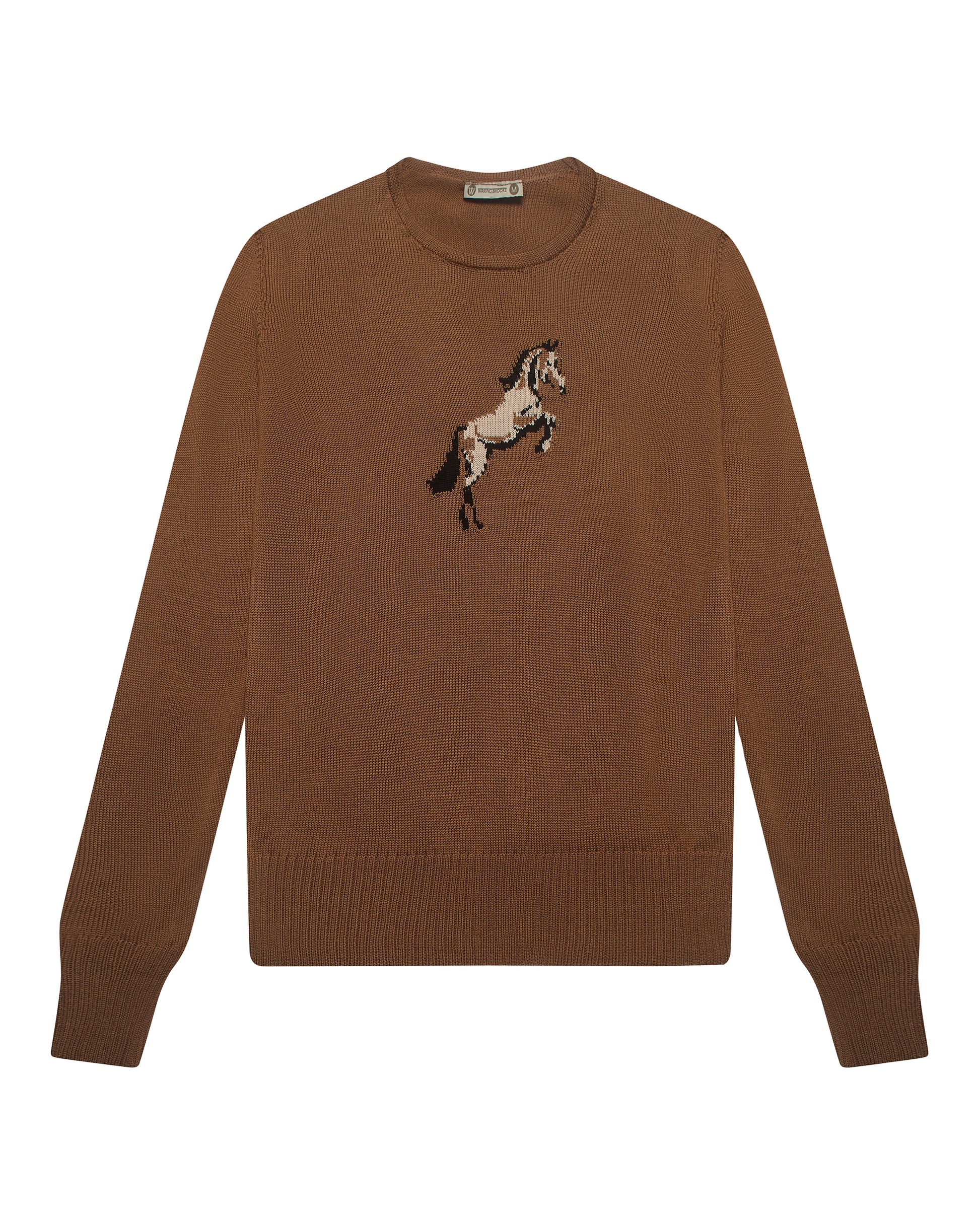Bold, elegant, and effortlessly refined – the Stallion Jumper is a tribute to the timeless power and poise of the horse. Knitted in Nottingham from 100% merino wool, this jumper features a proud stallion captured in motion, set against warm tan hues that echo the tones of the stable and field.